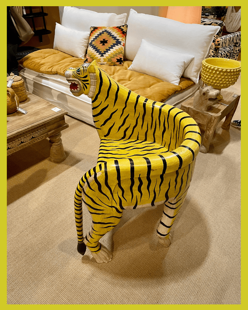 Pareil pour les animaux. Je me suis assise sur un superbe fauteuil tigre tout en rondeur (Chehoma), j’ai marché sur des tapis tigres aussi (Doing goods), vu voler des dauphins en fil de fer (Odile Moulin), trouvé des vases en forme de hiboux (Serax) et été charmée par des carafes à anses oiseaux (Bordallo Pinheiro).