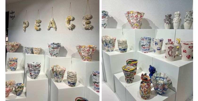 Et puis, au milieu de ce feu d’artifice de messages, un mot : PEACE. Bien sûr, s’il avait été imprimé sur une serviette ou sur un t-shirt, je serais passée sans m’arrêter. Mais là, sculpté en grandes lettres de porcelaine, travaillées avec soin dans la forme fragile et éphémère d’un ballon, le message prend une toute autre dimension. Contraste intéressant : délicatesse VS force, jeu VS gravité. Il devient un slogan subtil, qui résonne particulièrement par les temps qui courent.