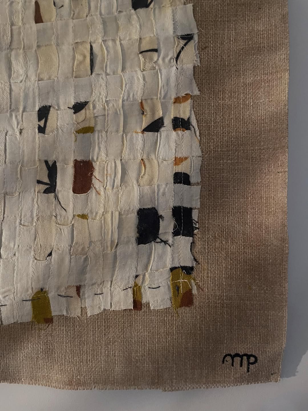 De ses collages naissent des vases, des paniers, des luminaires et plus récemment des tableaux tissés, pour lesquels j’ai eu un coup de foudre il y a quelques semaines. Ce travail de tissage est arrivé il y a un an et demi : “Je m’étais fracturée le poignet droit, je ne pouvais plus travailler. J’ai pris un cadre en bois, j’ai tendu des lanières de tissu et je me suis mise à tisser.” Cela donne des tapisseries modernes qui habillent magnifiquement les murs.